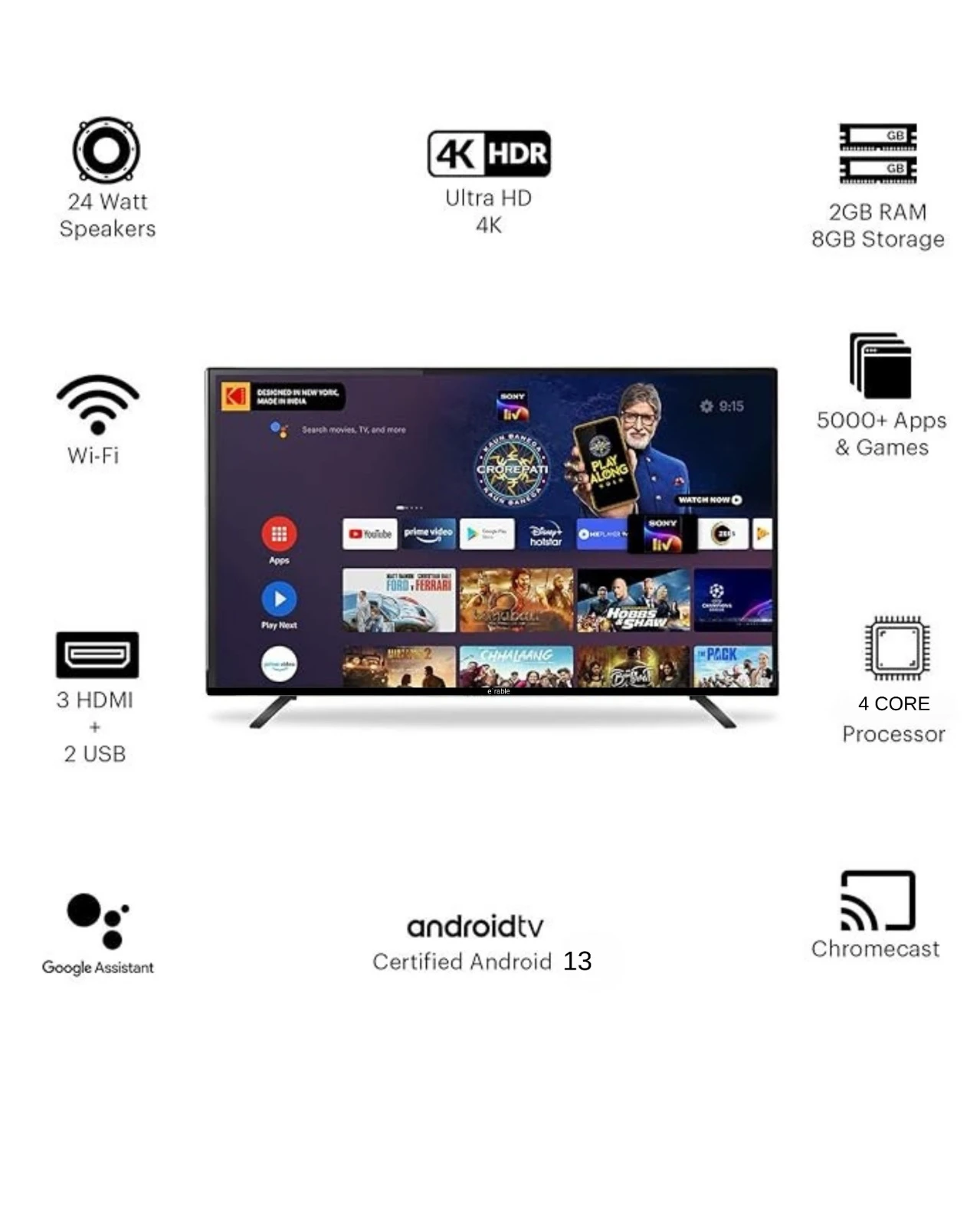 Whether you're enjoying the latest blockbusters, immersing yourself in a gaming adventure, or streaming your favorite shows, the 50" E’rable 4K TV ensures that your viewing experience is always smooth, vibrant, and incredibly immersive. With a sleek, modern design, it perfectly complements any home décor, making it not just a TV, but the centerpiece of your entertainment space.