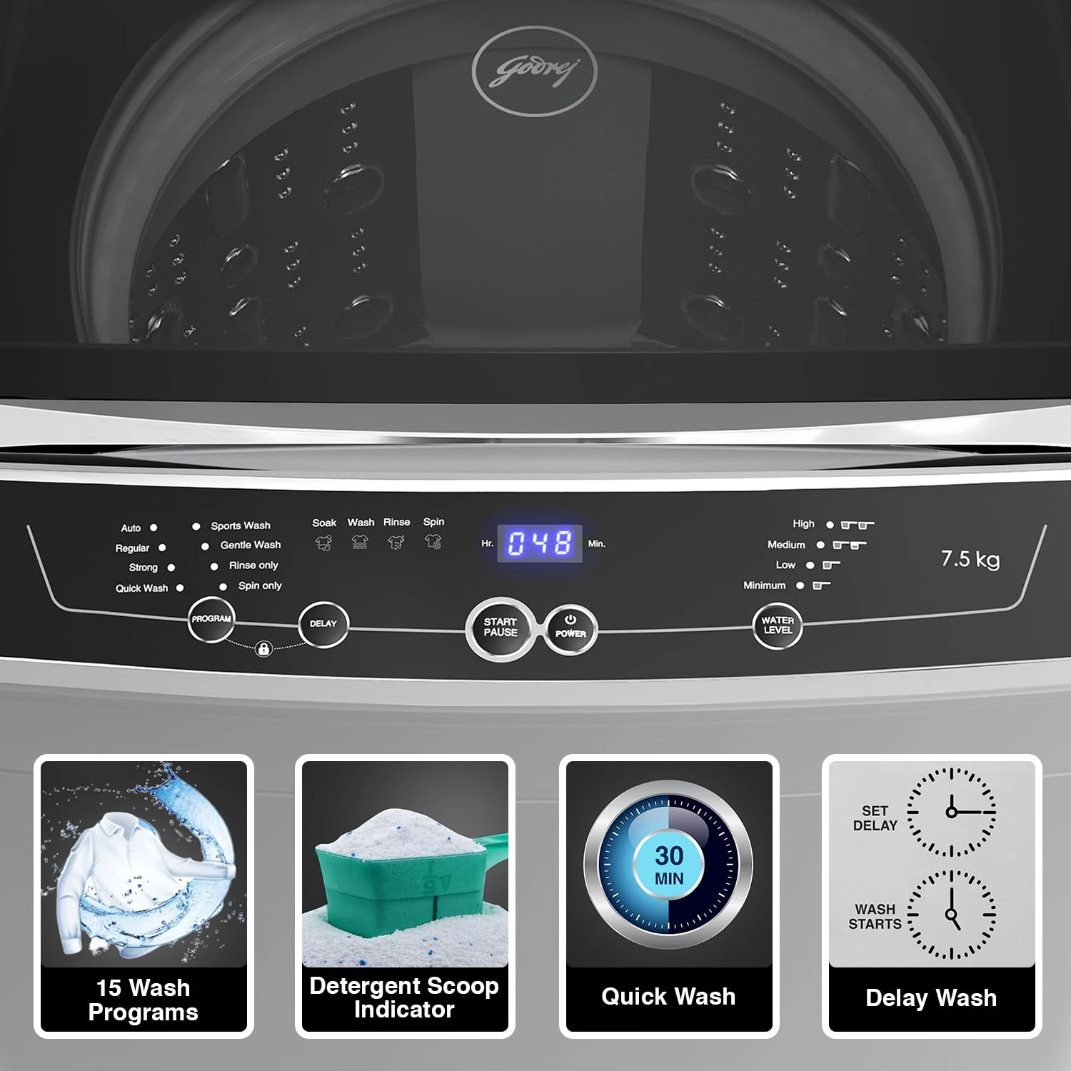 • Wash Programs: 15 wash programs: Auto, Auto + Soak, Normal, Normal + Soak, Strong, Strong + Soak, Quick wash, Quick wash + soak, Sport wash, Sport wash + Soak, Gentle wash, Gentle wash + Soak, Rinse only, Rinse + SPIN, Spin Only| Panel – Advanced Digital Panel