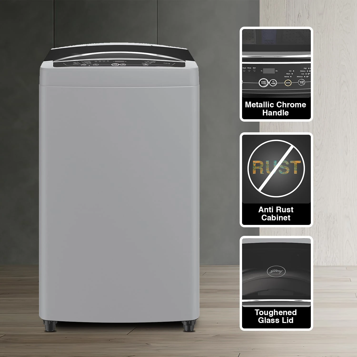 • Special features -‎ ‎Toughened Glass Lid | Auto Balance system | Anti Rust Cabinet | Advanced Digital Display | In Built Soak Technology | Auto Resume | Child Lock | Quick Wash | Delayed Wash | Detergent Scoop Indicator | Anti Rodent Mesh | 4 Water Levels
